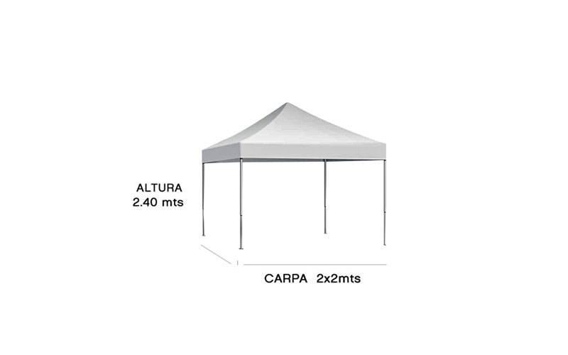 Alquiler carpas blancas 2×2 mts hasta 2.40 mts de altura. Tiene capacidad para una mesa redonda de 8 personas o una mesa de tablón para 10 personas.